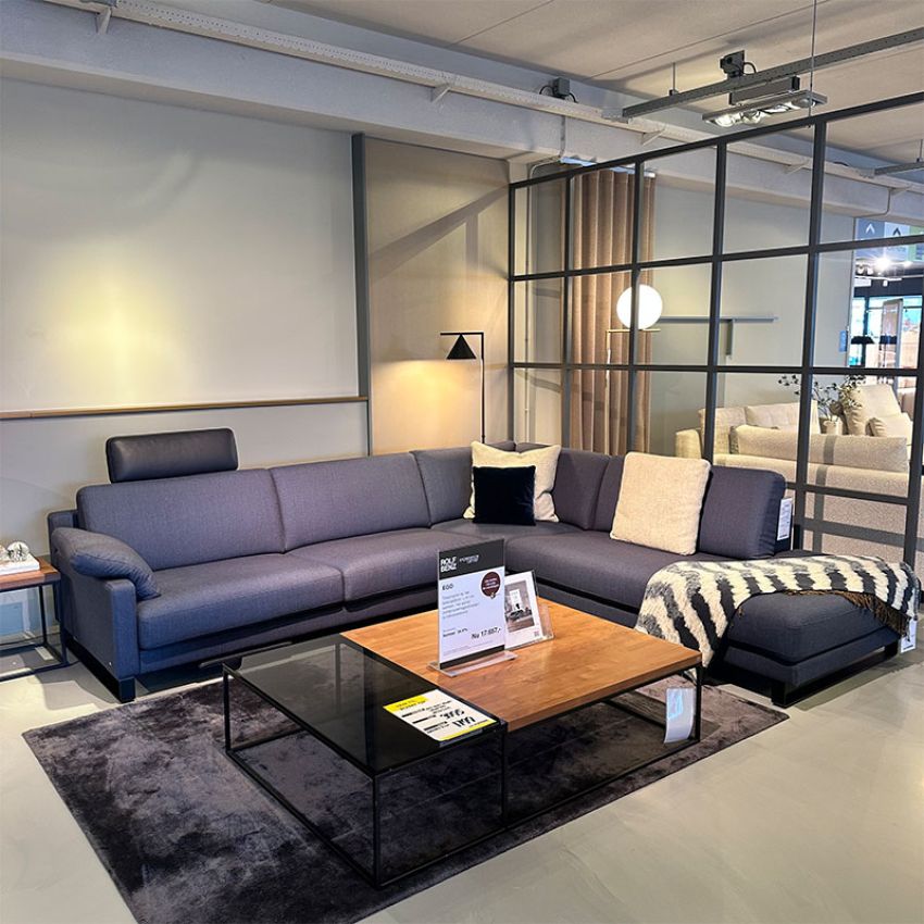 De Rolf Benz EGO hoekbank is uitgevoerd in de stof 28.179 (Fezwool 48) met een lederen voetensteun in 38.109 grijsblauw.