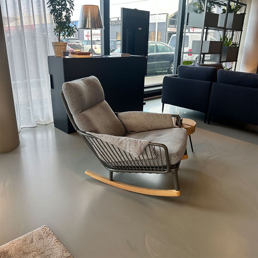 De Rolf Benz RB 271 schommelstoel is uitgevoerd in een combinatie van aluminium, teak en stof.