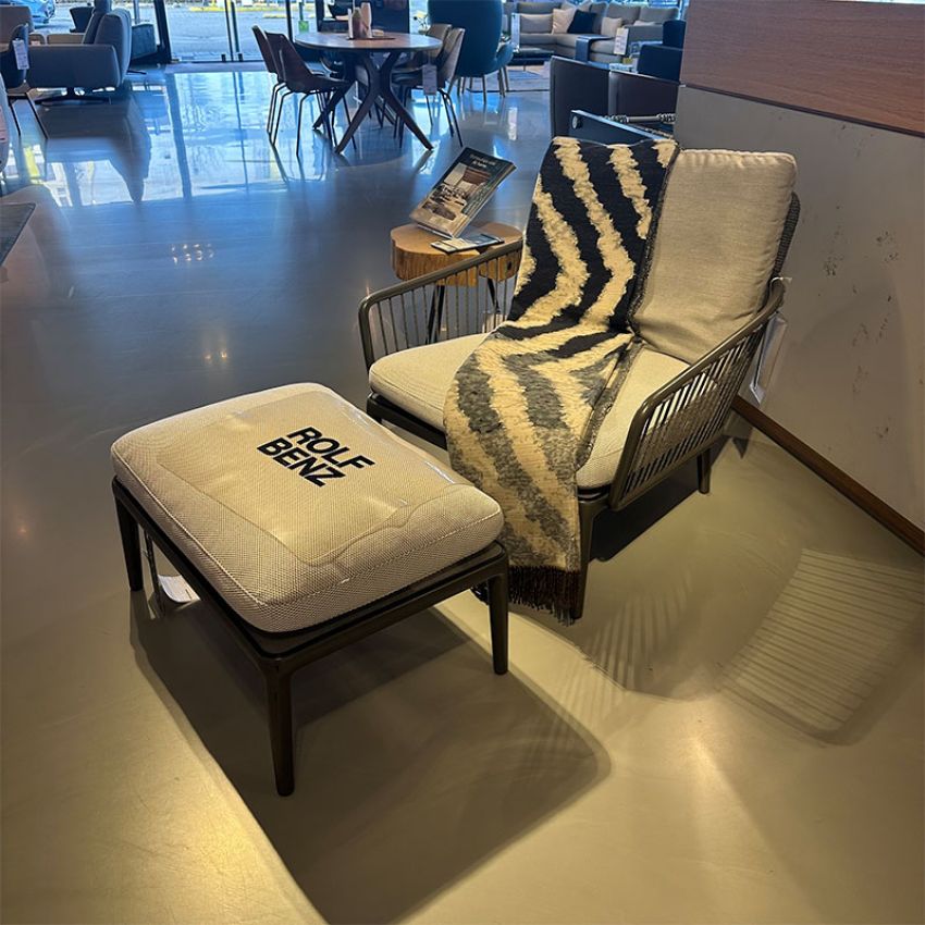 Rolf Benz RB 271 fauteuil en hocker uitgevoerd met zitkussens in de stof 24.760 grijs met een aluminium gepoedercoat onderstel. De fauteuil wordt geleverd inclusief handige afdekhoes.