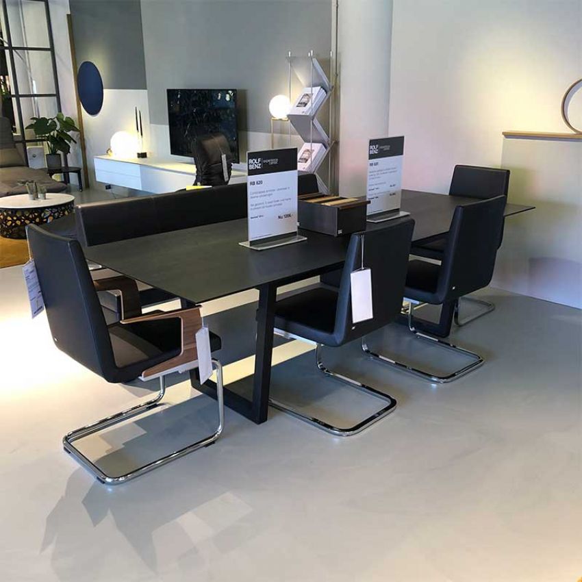 De Rolf Benz RB 924 eetkamertafel is uitgevoerd in zwart gebeitst massief eiken. Het blad van de tafel is afgeschuind.