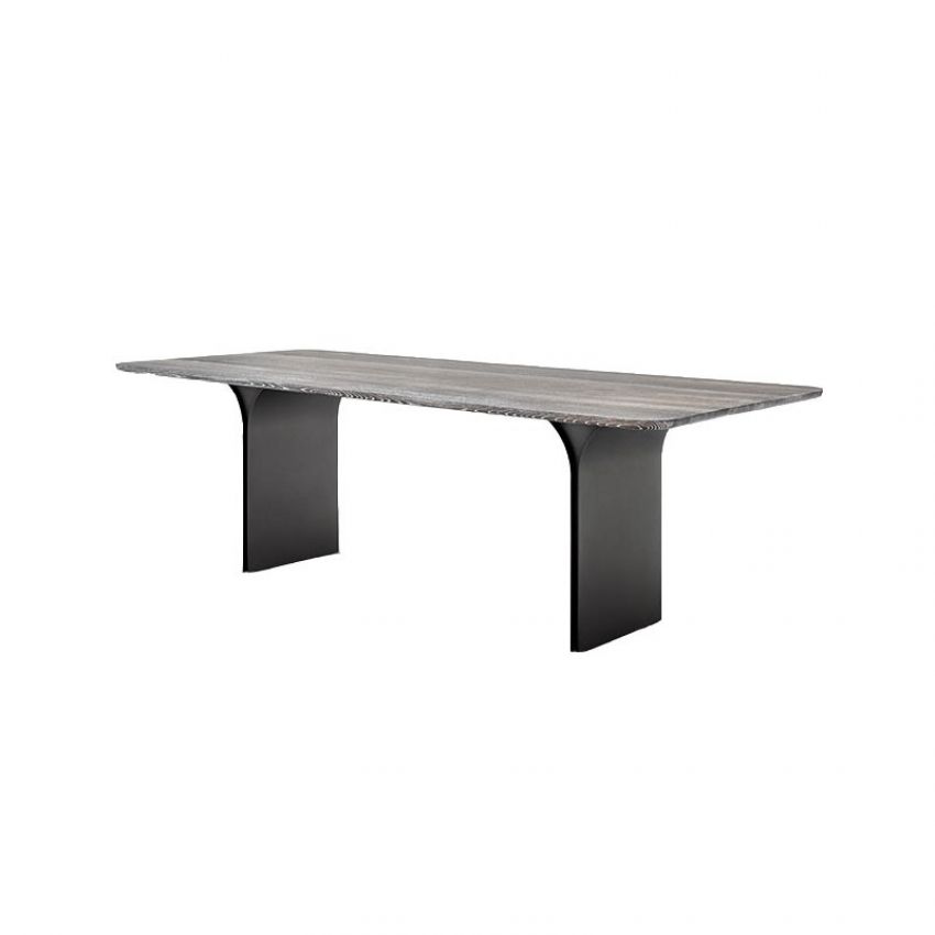 De massieve eikenhouten tafelblad wordt met de hand geborsteld en indien gewenst gekalkt, waardoor het een opvallende textuur krijgt en rustieke accenten toevoegt. Ondanks zijn gewicht lijkt het zwevend op de slanke wangen die zich sierlijk naar het tafelblad openen. Bijzonder aantrekkelijk zijn de zachte rondingen langs de randen, die het contrast tussen het zware eikenhout en de delicate uitstraling van de wangen benadrukken, en het tafelblad tegelijkertijd een heerlijk aanvoelende ervaring geven.